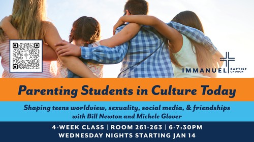 Join us for a helpful 4-week class, Parenting Students in Culture Today, where we’ll explore how to shape your teen’s worldview, sexuality, friendships, and online habits through a biblical lens.